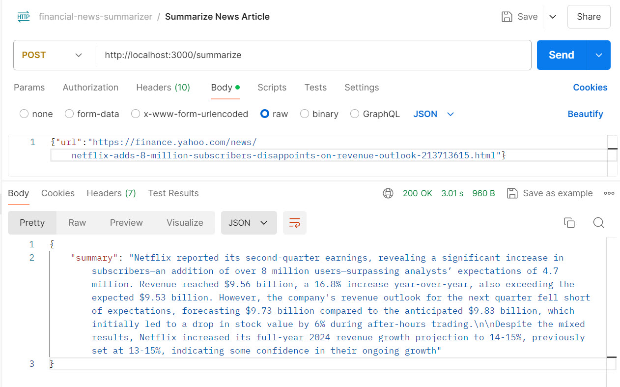 Now, you can send POST requests to http://localhost:3000/summarize with a JSON body containing the url of the financial news article you want to summarize.